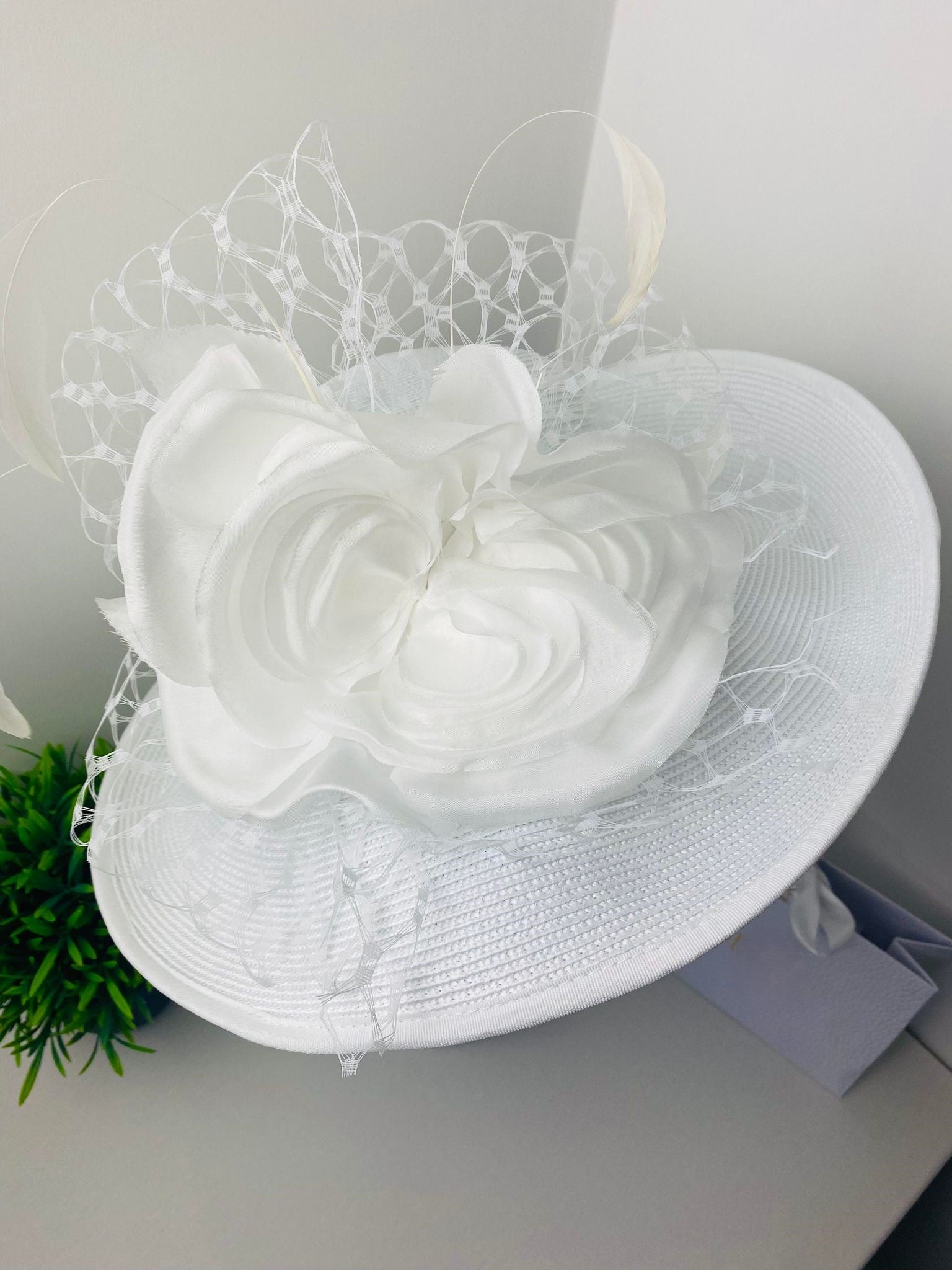 Crafted from polybraid fabric in a flexible hat style, this stunning piece features a large silk floral arrangement & crin bow/band.