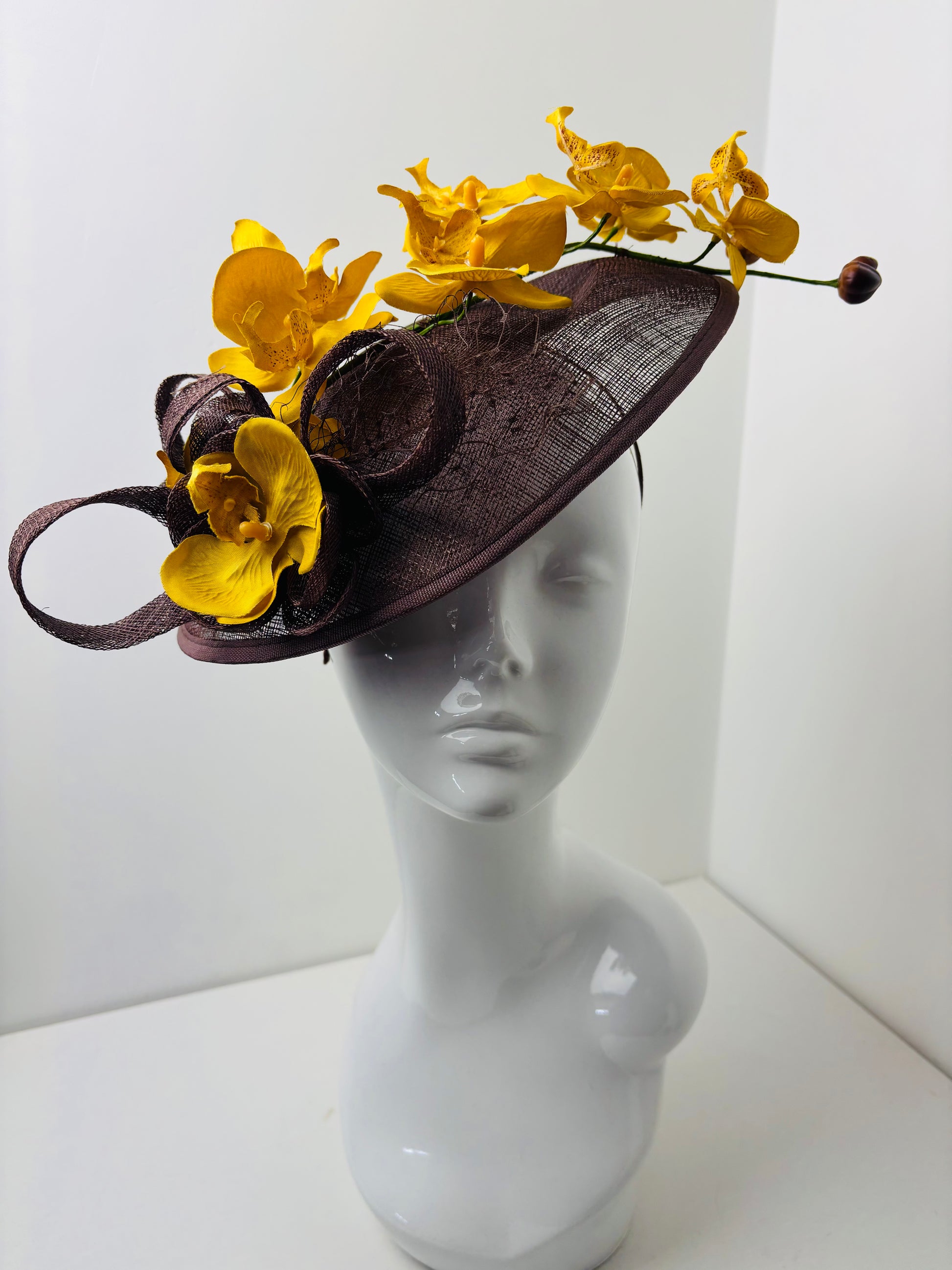 Crafted using vintage mustard orchid florals, natural sinamay & pretty net detail.