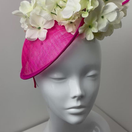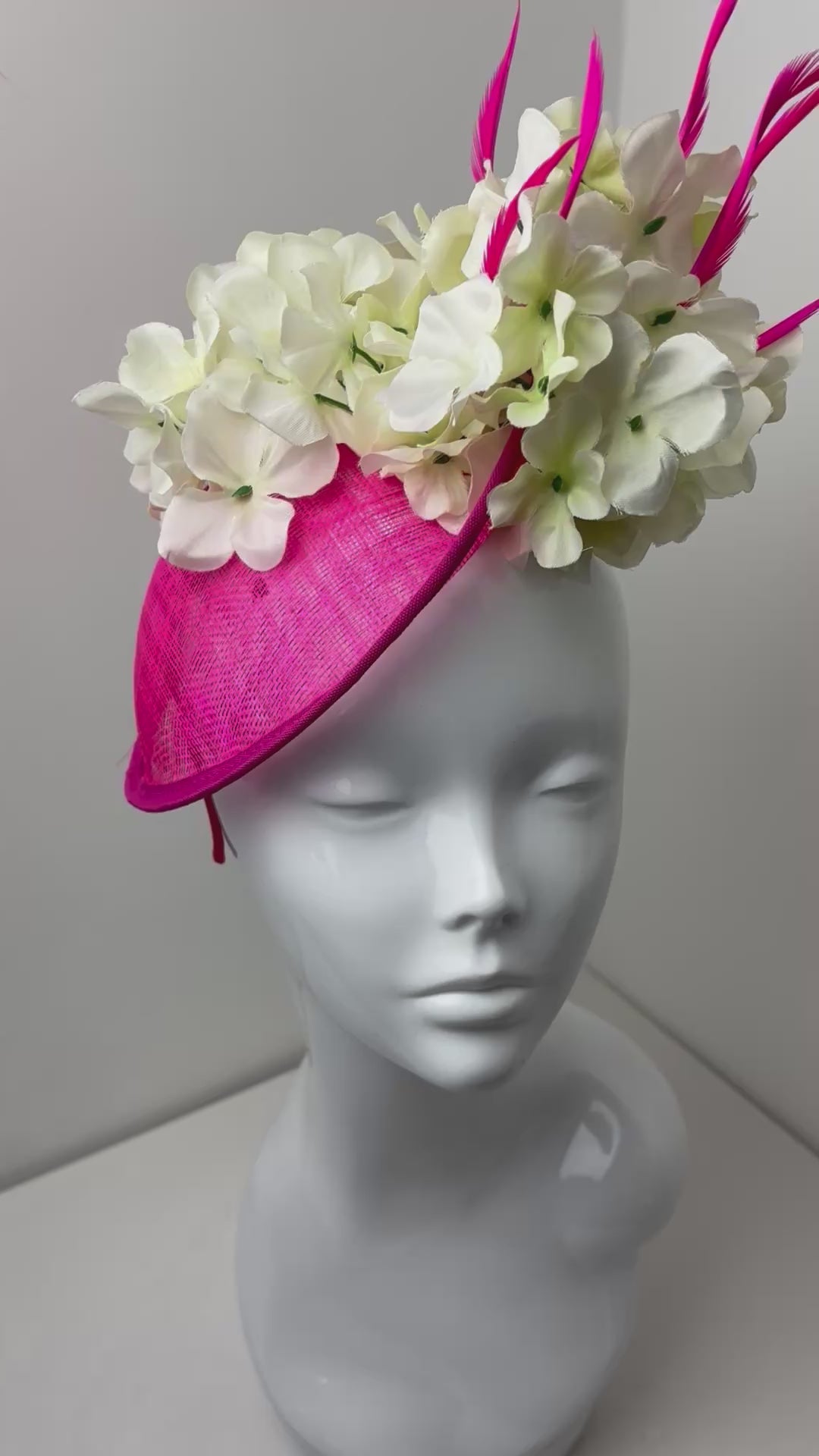 Handmade by us in Northumberland one off piece in hot pink with cream and ivory floral vintage flowers & flared goose biot.
