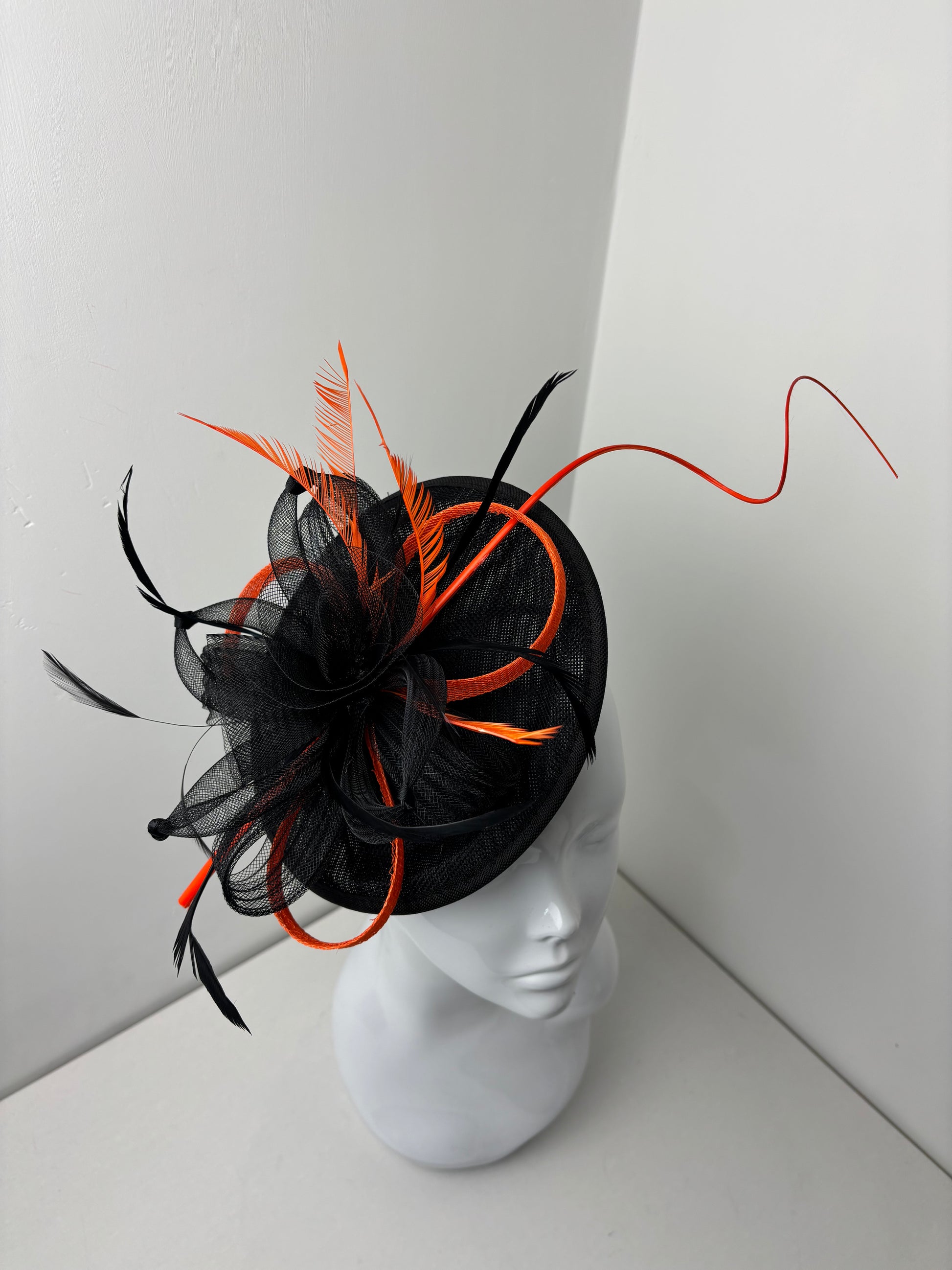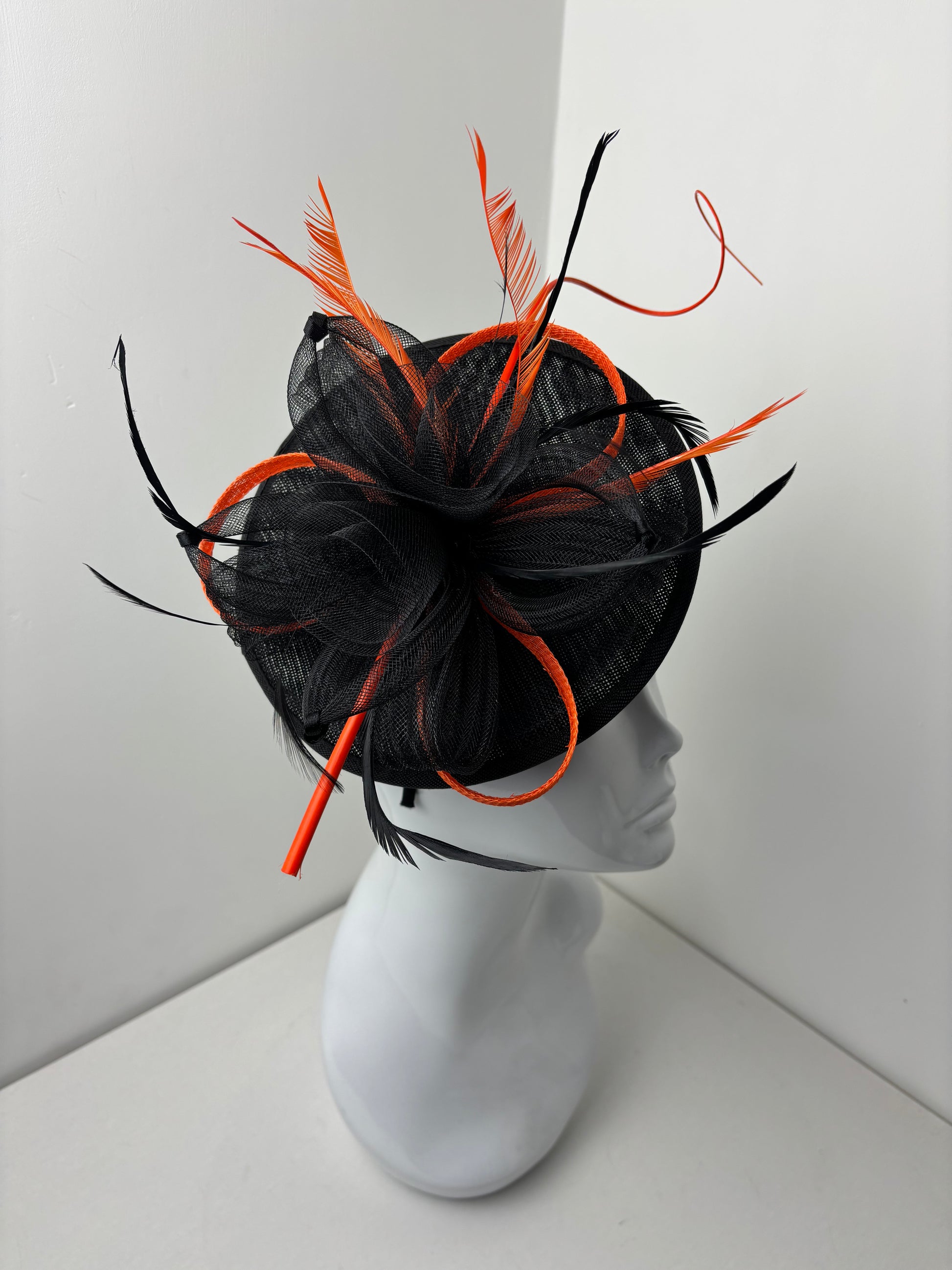 Pretty loops and floral details with complimenting feathers & curled quill are adorned on a black sinamay disc base.