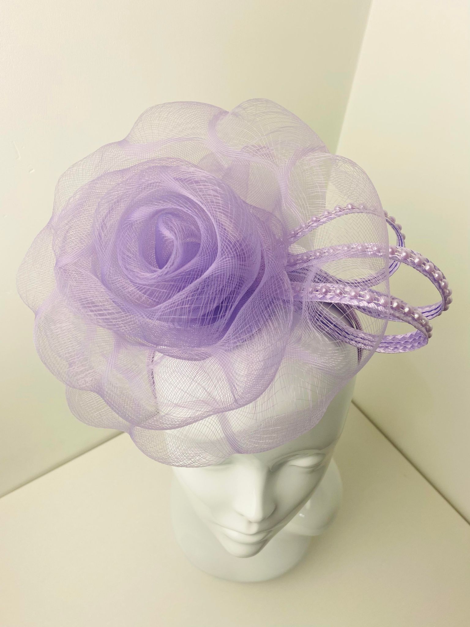 This pretty rose detail fascinator has been beautifully moulded in lilac & features pretty poly braid pearl details.
