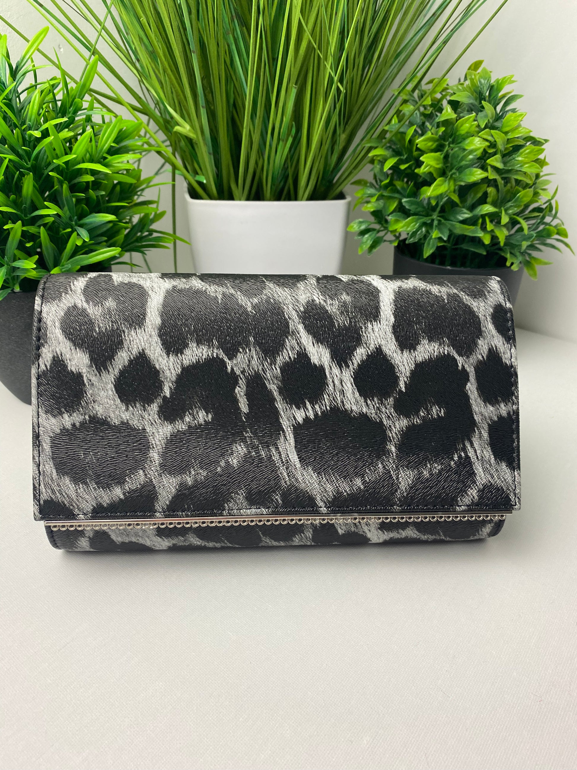 Show your wild side with this on trend clutch in black and grey leopard print.