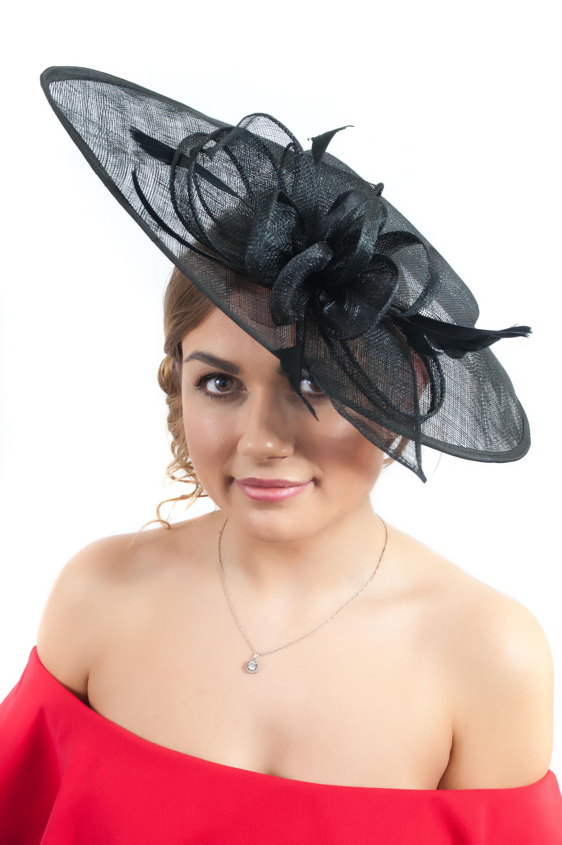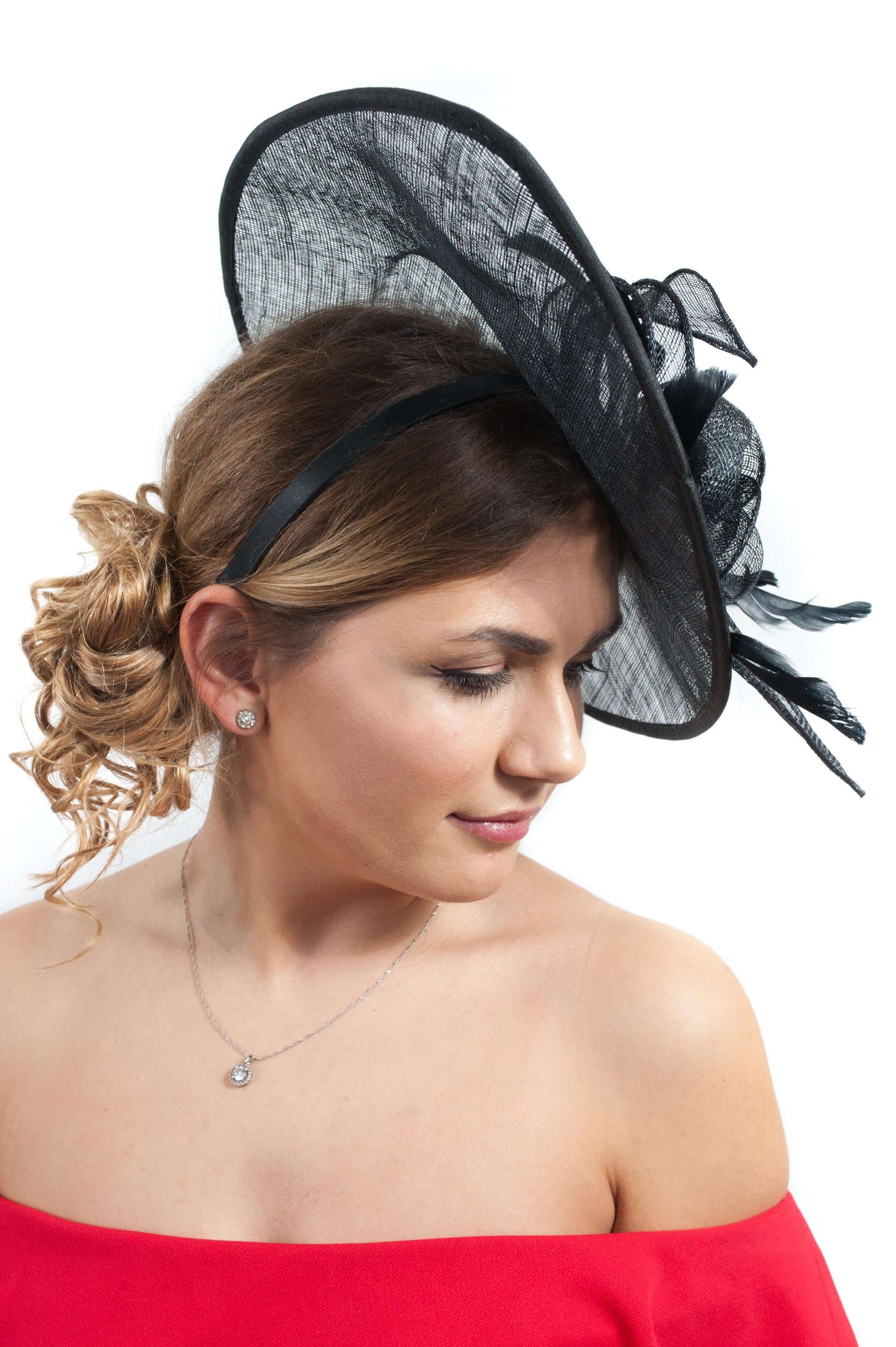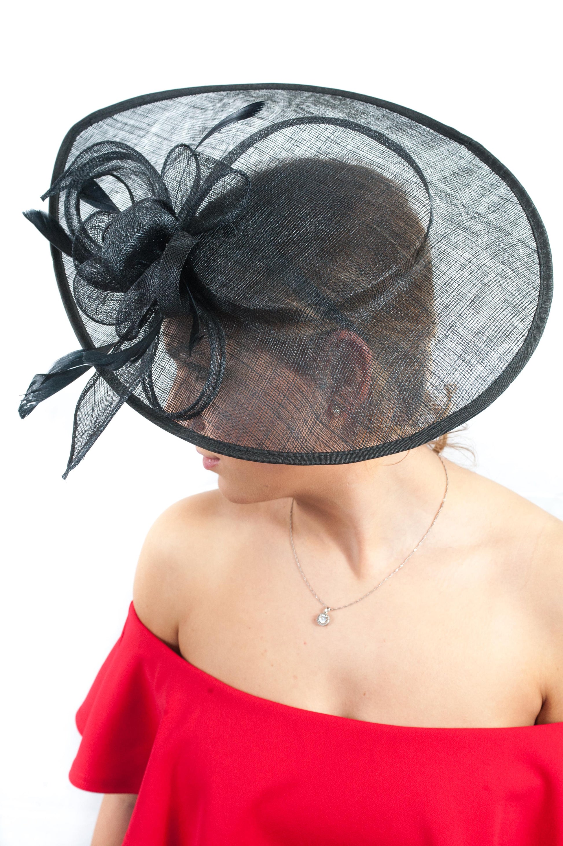 Crafted from natural sinamay, this style can be worn either side with the teardrop angled either to the top or bottom. For illustrative purposes, it is shown on our model on her left hand side.