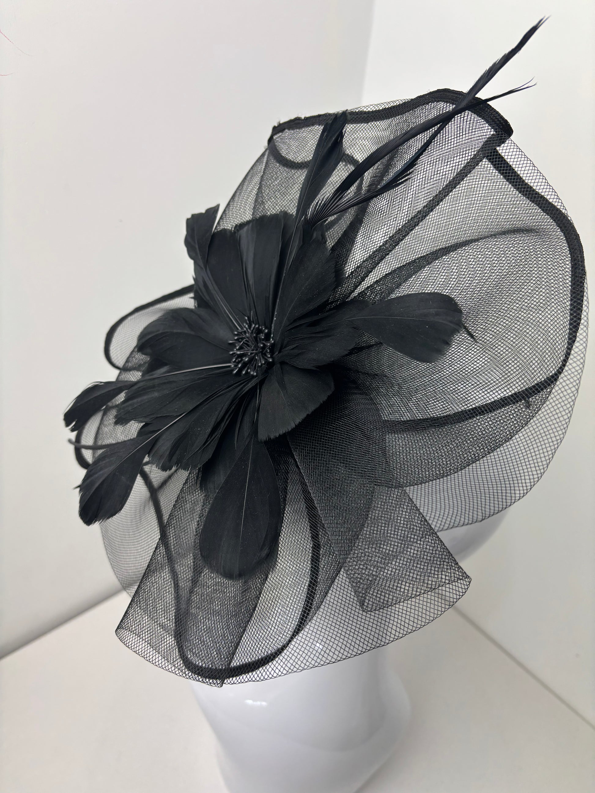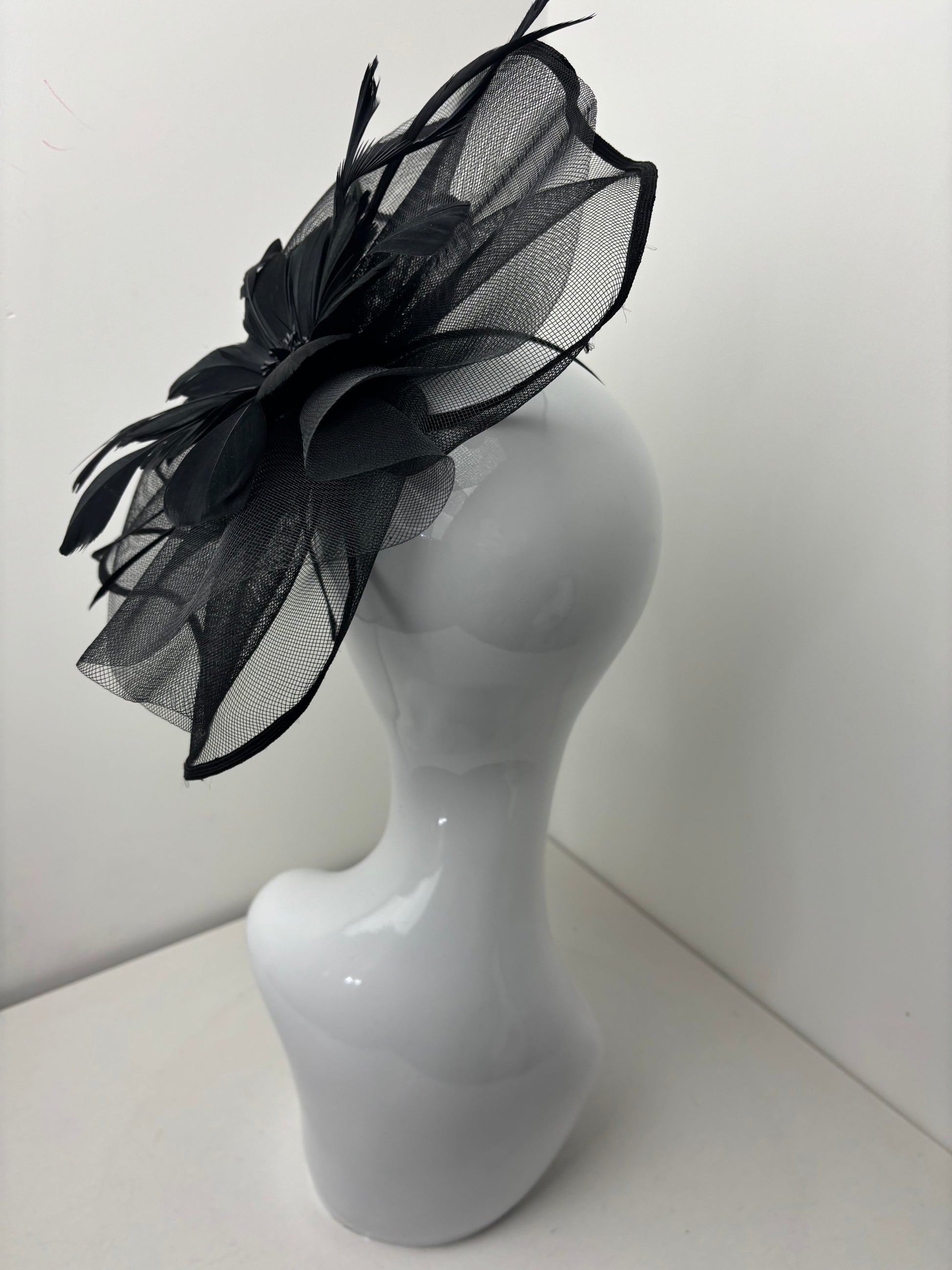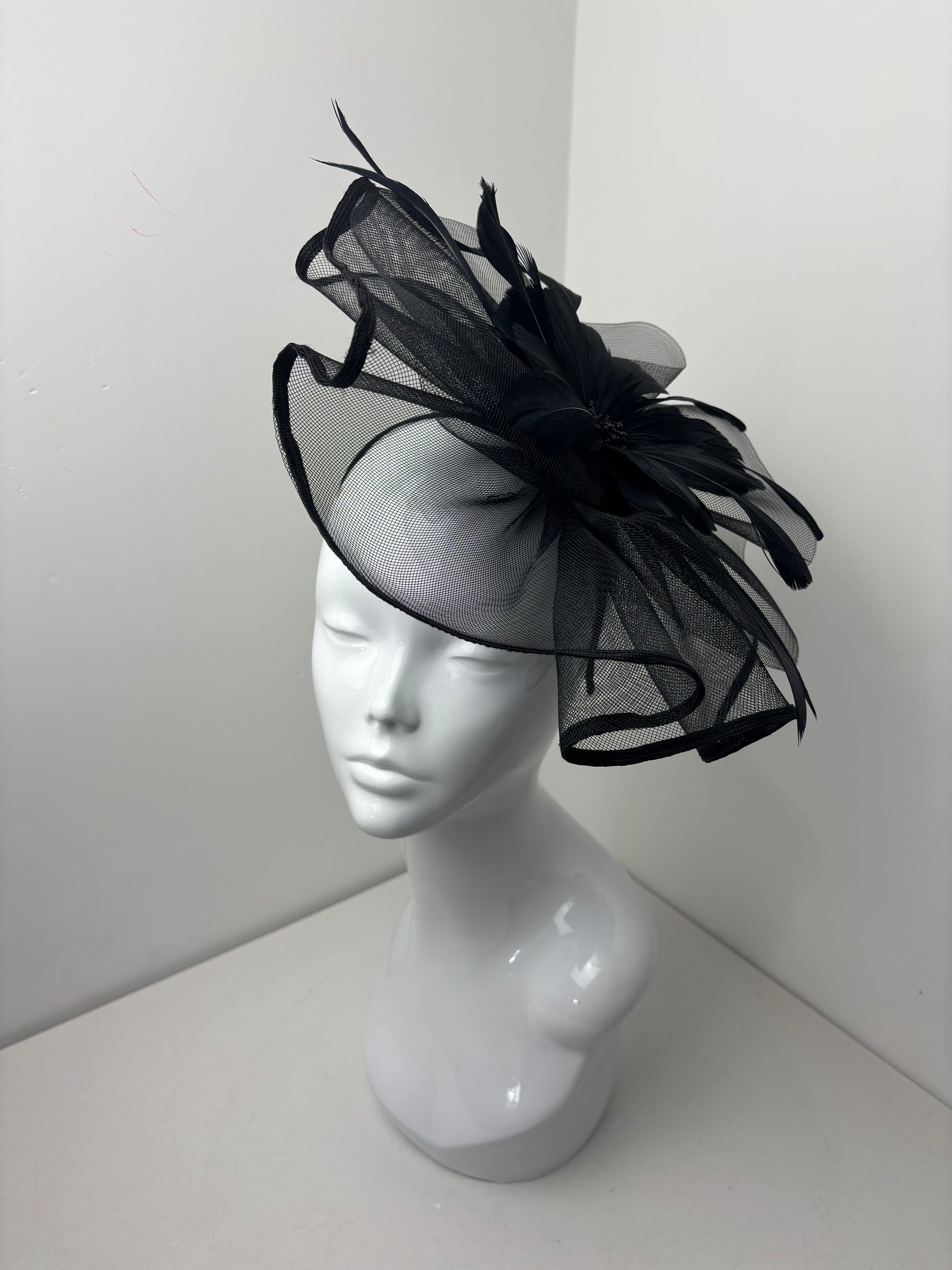 Large Black Organza Ruffle Fascinator - Featuring a pretty floral centre detail.